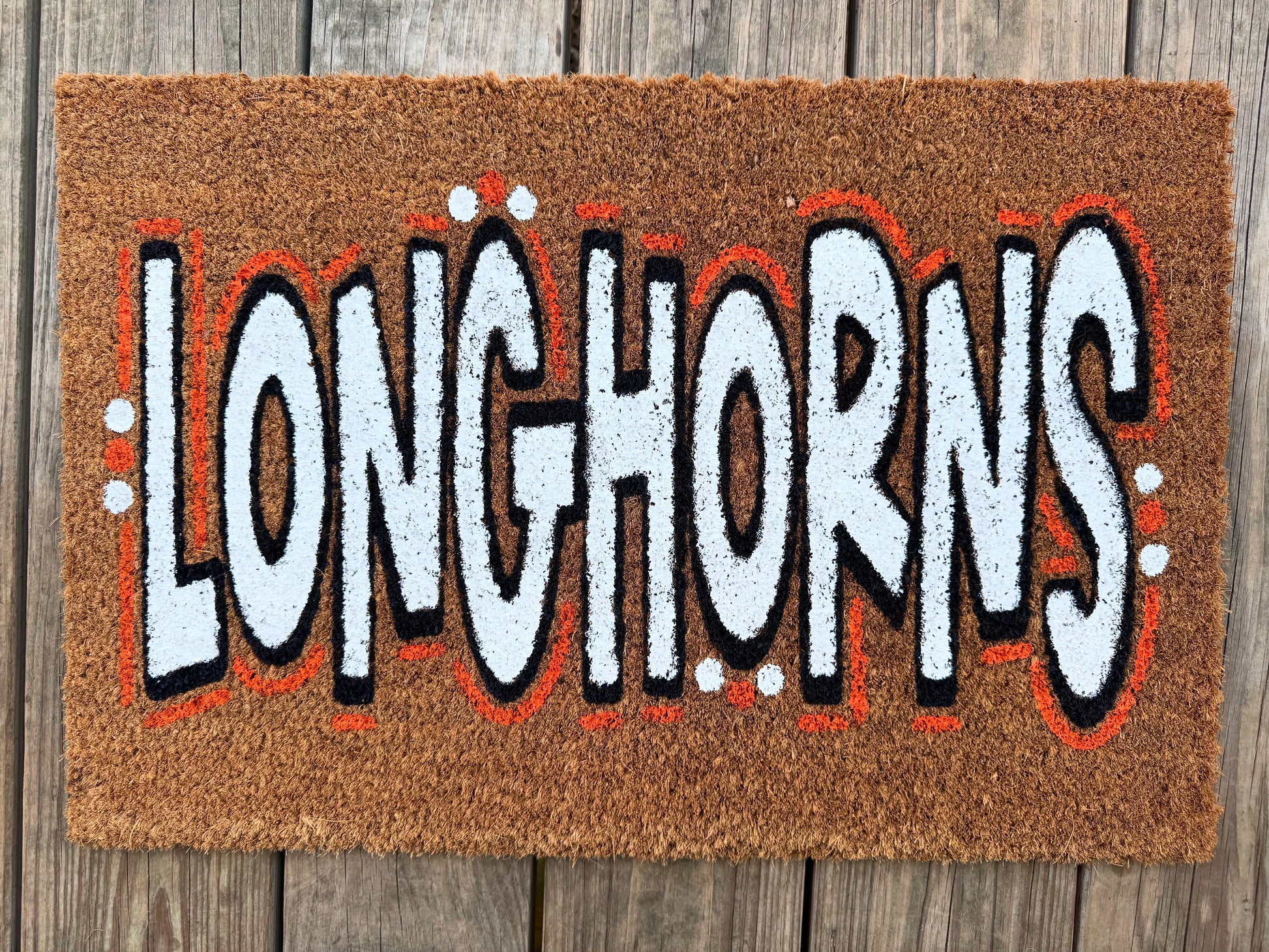 This hand-painted welcome mat features a bold, playful doodle font reppin’ your Longhorn pride in true Texas style. Whether you’re a proud UT alum, current student, or just love everything burnt orange, this mat is made to make a statement—right at your doorstep. Durable, unique, and full of spirit, it’s the perfect blend of home sweet home and hook ’em horns.